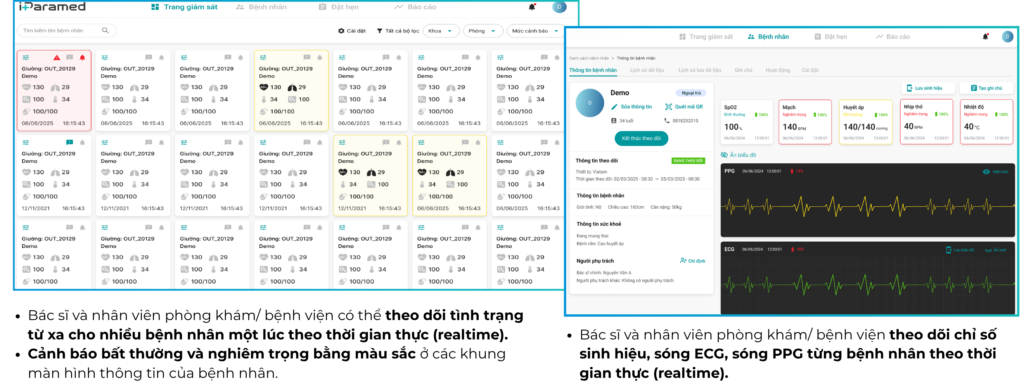 Theo dõi các chỉ số sinh hiệu của người dùng và bệnh nhân (bao gồm SPO2, huyết áp, nhiệt độ, ECG,….) theo thời gian thực bằng các thiết bị y tế thông mình và có thể kết nối từ xa.